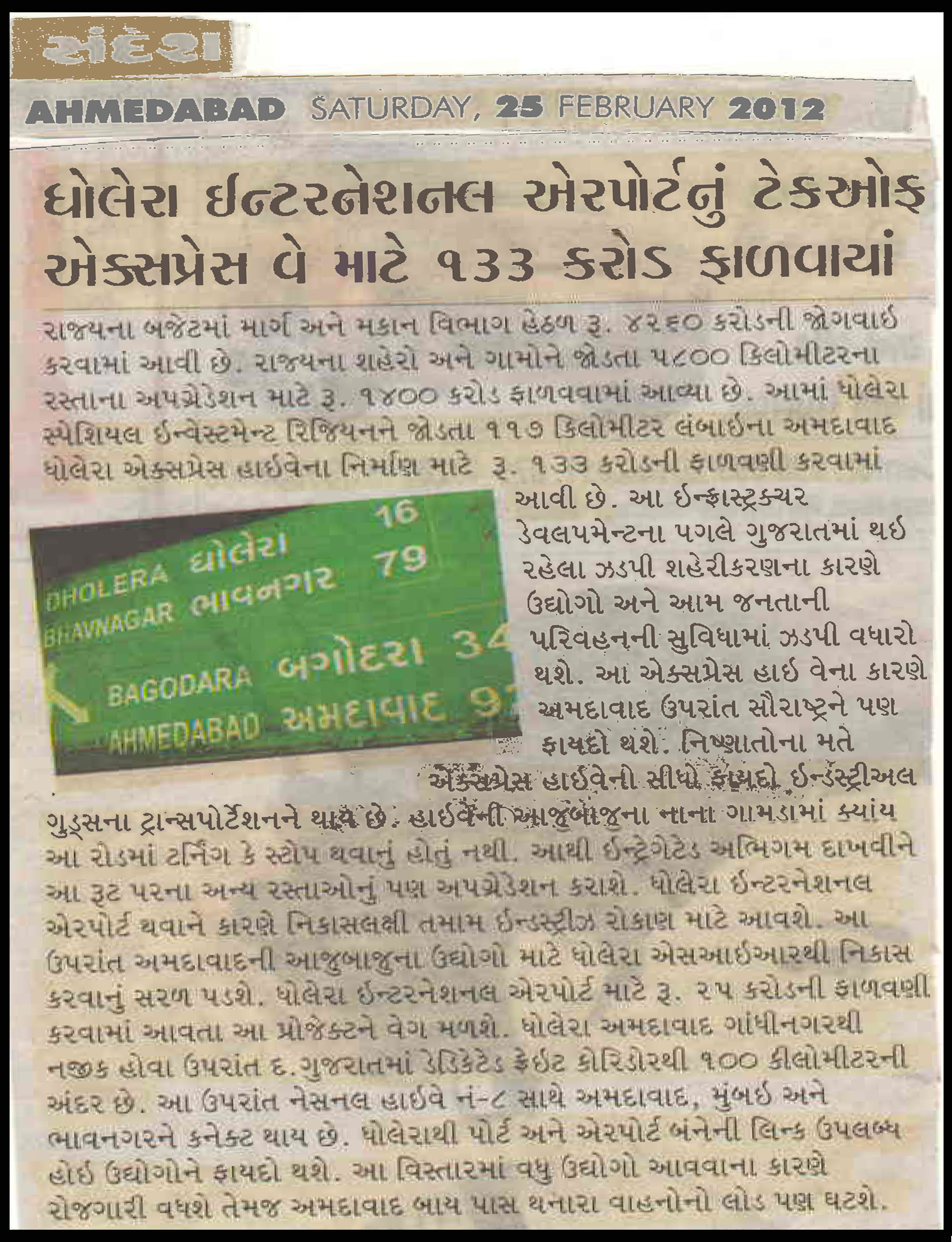 Rs. 133 Cr. INVESTEMENT FOR CONSTRUCTION OF EXPRESSWAY CONNECTING DHOLERAINTERNATIONAL AIRPORT.