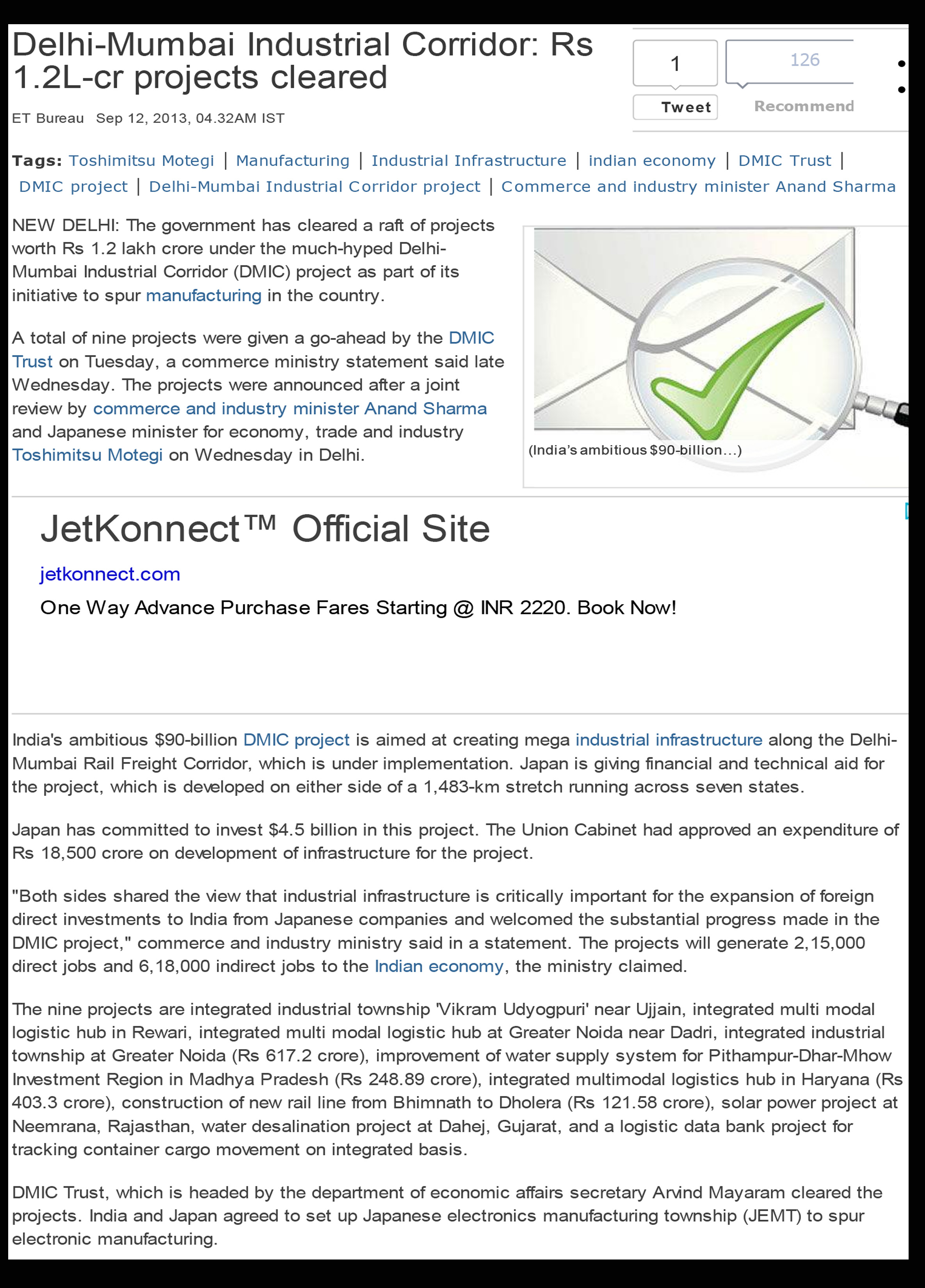 DELHI – MUMBAI INDUSTRIAL CORRIDOR: RS. 1.2 L – Cr. PROJECTS CLEARED.