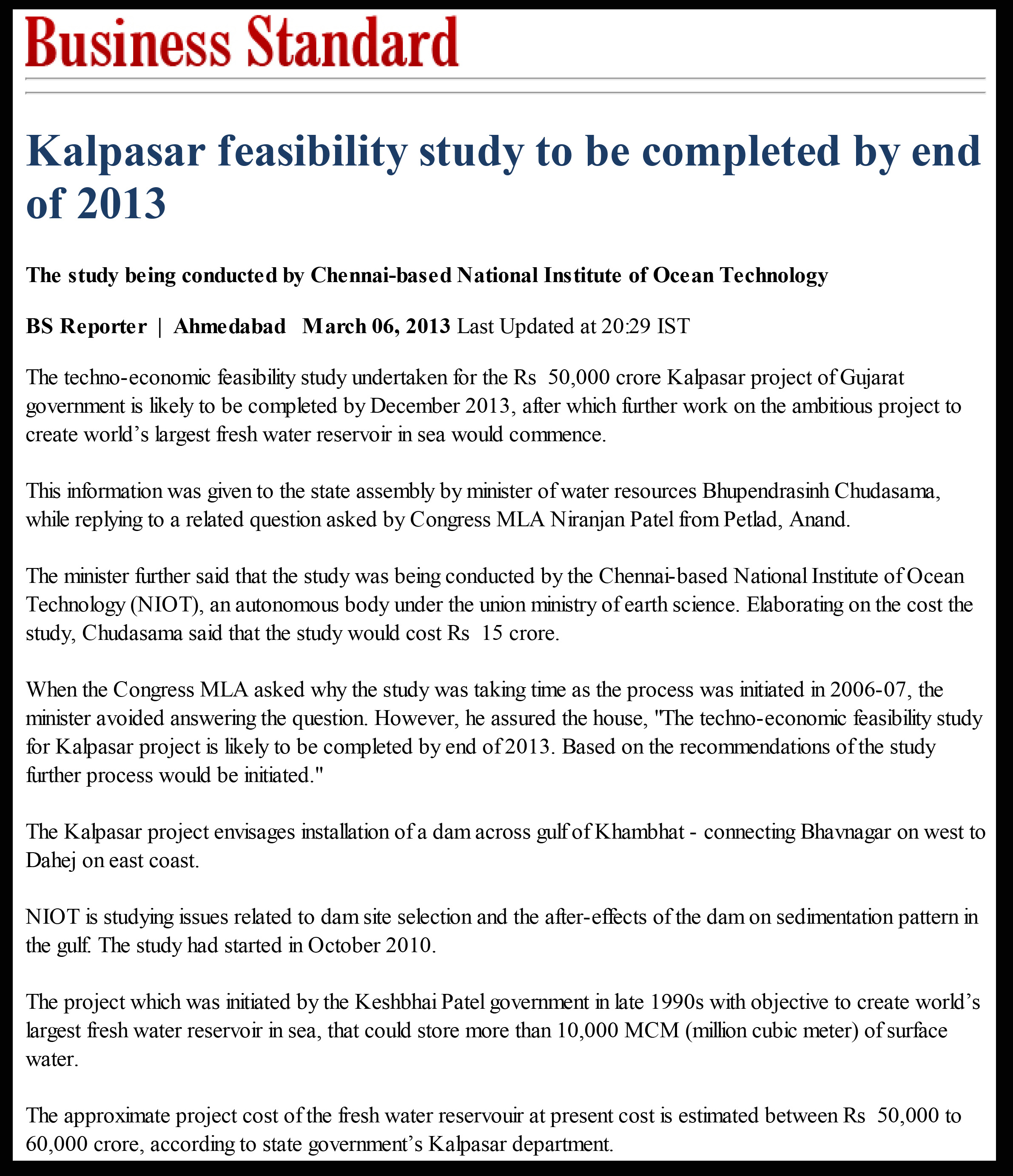 KALPASAR FEASIBILITY STUDY TO BE COMPLETED BY END OF 2013