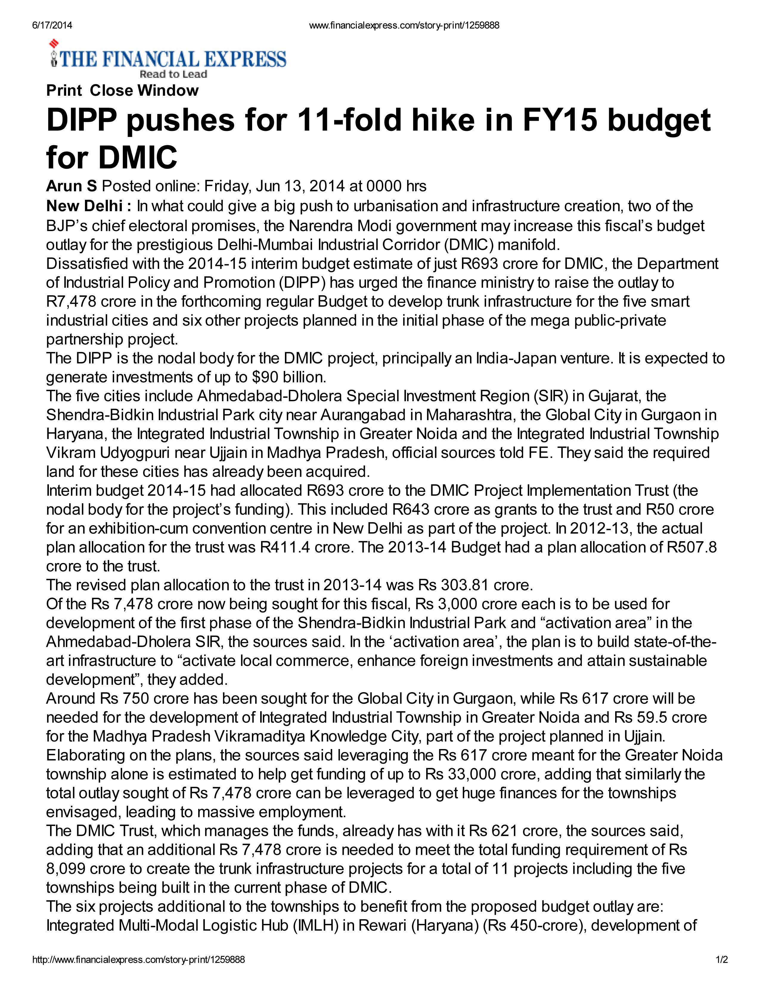 DIPP PUSHES 11 FOLD HIKE FOR TRUNK INFRASTRUCTURE IN FY15 BUDGET FOR DMIC.